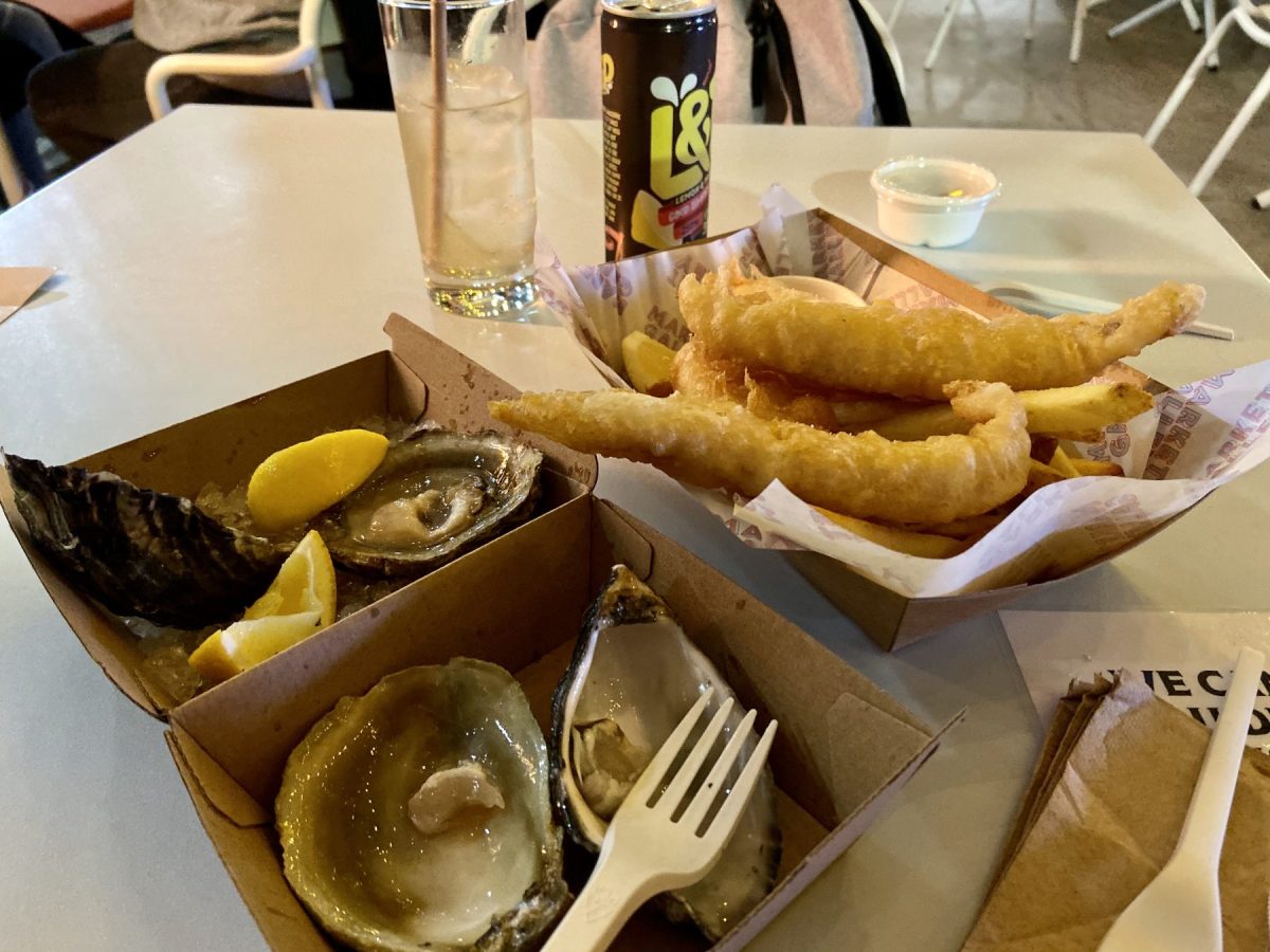 We stopped through for a Moa Beer and some freshly battered fish and chips with an entree of Oysters. Delicious.