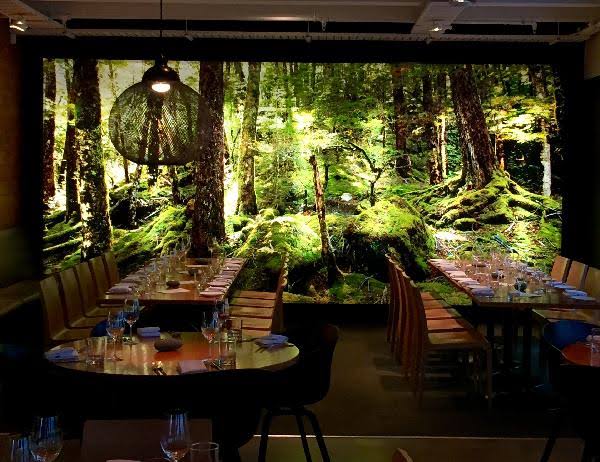 The restaurant’s design reflects a contemporary aesthetic, with large windows that allow natural light to flood the space, enhancing the connection to the surrounding urban forest. Natural materials and minimalist decor create a warm and inviting environment, perfect for a relaxed dining experience.