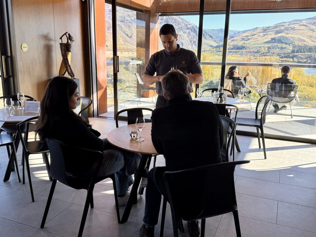 When we walked inside, we were immediately greeted by one of the staff members. They were friendly, down-to-earth, and clearly knew their stuff. The tasting room has big windows that look straight out over the vineyards, and the view is incredible. You can see the vines stretching out below, framed by the rugged hills of Central Otago.