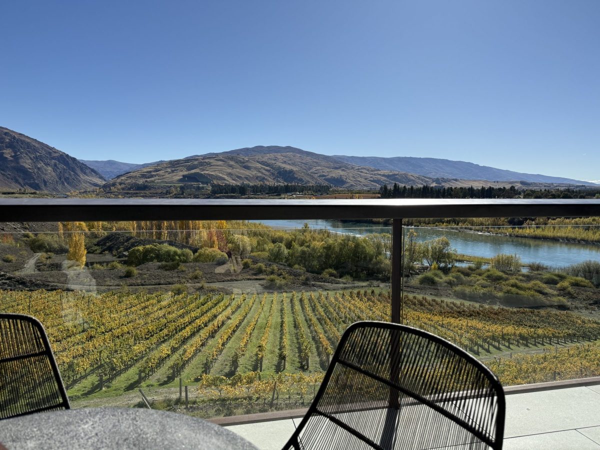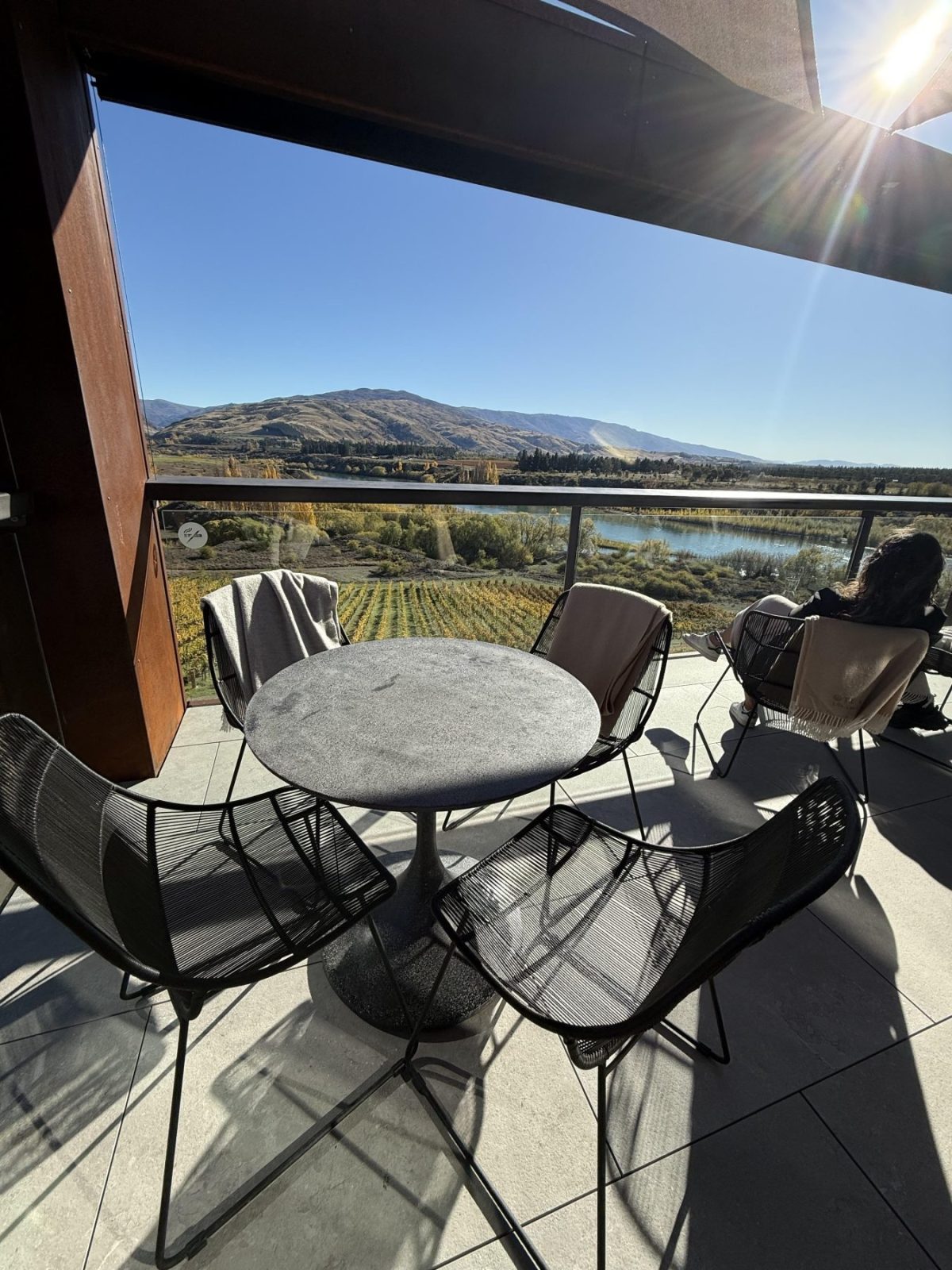 After the tasting, we took our glasses outside to the terrace. There are a few tables overlooking the vineyard, and it’s one of those spots where you just naturally slow down. The view across the Bannockburn hills is something else — dry, rocky, and peaceful all at once.